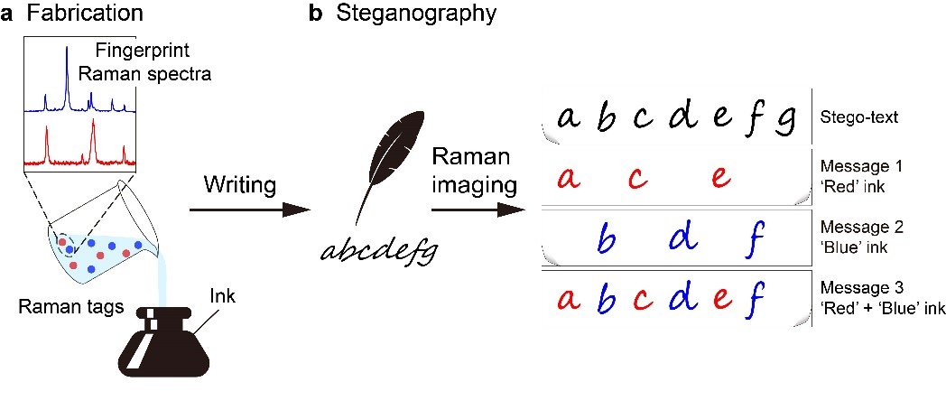 广泛使用的一种隐写术就是安全墨水,其中又以隐形墨水最为常见。这种墨水在自然条件下肉眼不可见,但借助热、水、光、特殊化学物质等显影手段能够显现出来。但是,传输完全空白的内容容易引起怀疑,导致信息不安全。一种解决办法是用特殊墨水书写信息,并藏于普通墨水书写的文本中。这样,自然条件下看到的是表面内容,只有借助某种显影手段才能看到真实信息。我们可以通过在普通墨水中掺入具有某种光学性质的纳米颗粒来制备特殊墨水,这样借助相应的成像手段就能将隐藏信息显影出来。表面增强拉曼(SERS)纳米颗粒由于特异性和灵敏度高、稳定性好、易于合成的特点,特别适合用于隐写术。与常见的荧光墨水相比,拉曼墨水光稳定性更好,且谱峰窄适于多指标,因此能够实现多色隐写。