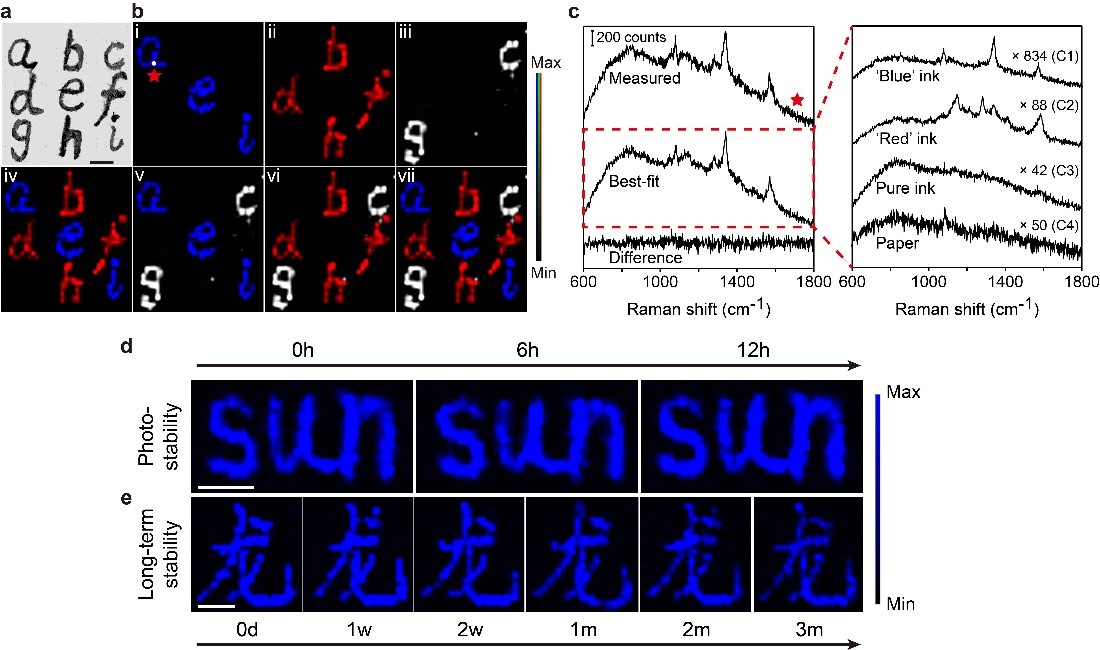 2021年1月,williamhill威廉希尔官网的叶坚课题组在Advanced Optical Materials发表了题为Raman ink for steganography的论文。该工作开发了一种基于缝隙增强拉曼纳米颗粒(GERTs)的拉曼墨水用于隐写术。通过将两种不同的GERTs掺入普通墨水,得到两种具有不同拉曼信号的拉曼墨水用于多色隐写。在785纳米非共振激发下,GERTs墨水能够产生显著的特征拉曼信号,同时墨水的背景干扰很低,证明其用于信息编码的优越性。不同的拉曼墨水能够同时用一种波长激发,有效缩短了成像时间。同时,GERTs墨水具有好的光稳定性和长期稳定性,保证了书写文本的长效性。实验中用两种制得的GERTs墨水和普通墨水进行多色隐写,总共能提取出七种不同的信息组合。拉曼墨水出色的多指标编码能力保证了隐写系统的安全性和可靠性,因而在信息安全领域具有广阔的应用前景。