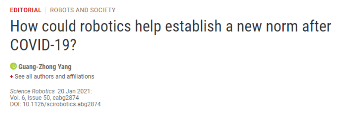 医疗机器人研究院杨广中教授在Science Robotics杂志发表关于机器人技术如何协助建立新规范的社论