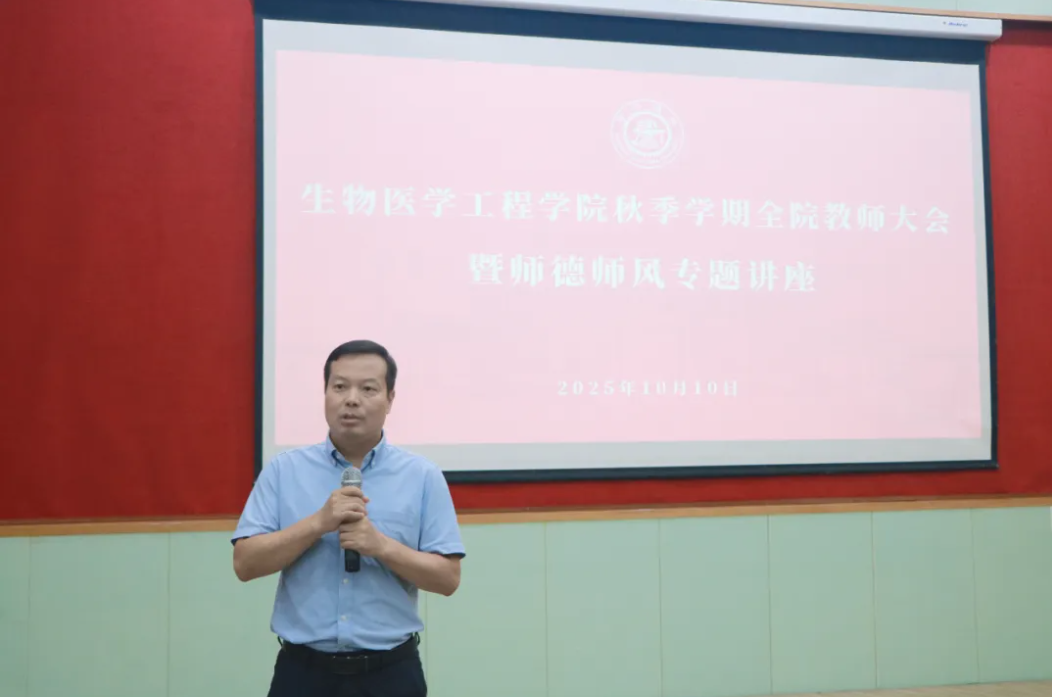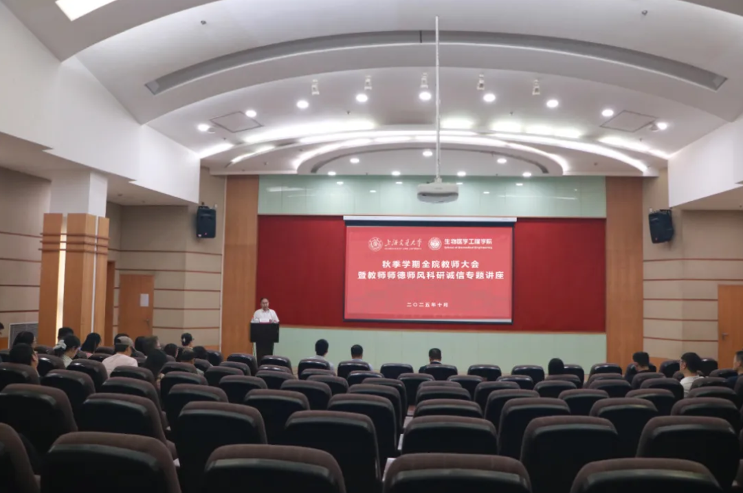 2025年10月10日下午,williamhill威廉希尔官网在闵行校区文选医学大楼一楼报告厅举行2025年秋季学期全院教师大会暨师德师风科研诚信专题讲座。学校人力资源处副处长、党委教师工作部常务副部长陈贤峰,研究生院国际化办公室主任赵凤及办公室成员陈卜侨、陈铖、薛循丹,出入境管理与服务中心副主任万芸芸、事务主管胡新怡,学院部分领导班子及教师代表出席会议。大会由学院党委书记孔令体主持。