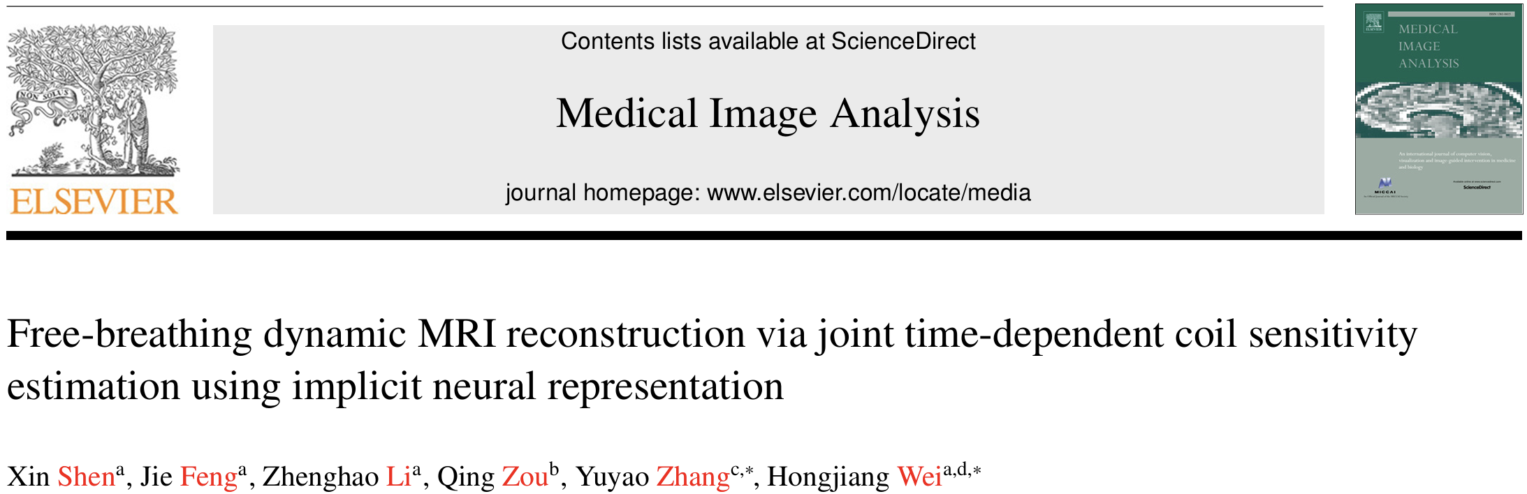 [1] Shen X, Feng J, Li Z, Zou Q, Zhang Y, Wei H. Free-breathing dynamic MRI reconstruction via joint time-dependent coil sensitivity estimation using implicit neural representation. Medical Image Analysis. 2025. doi: https://doi.org/10.1016/j.media.2025.103847.
