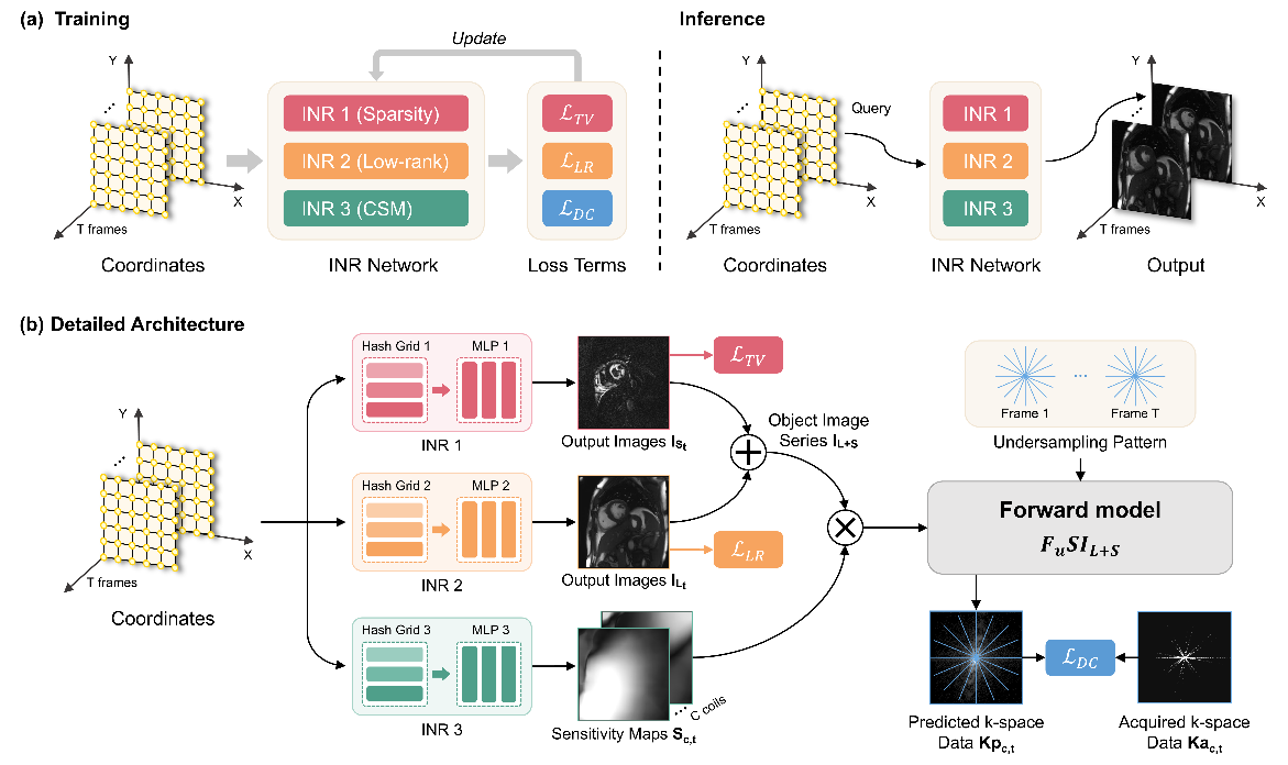 该方法基于隐式神经表示(Implicit Neural Representation, INR)的思想,将动态磁共振图像及线圈灵敏度图统一建模为从时空坐标到信号强度的连续函数,有效挖掘了图像在时空维度的隐式连续性先验。通过引入低秩加稀疏分解框架,有效分离并正则化背景缓慢变化成分与动态显著变化区域,增强了模型对运动细节的敏感性与重建保真度。同时,通过INR进行线圈灵敏度图的动态联合估计,显著缓解了传统方法因静态灵敏度假设带来的重建伪影。上述策略协同作用,极大提升了高加速倍数下自由呼吸动态磁共振的重建质量与鲁棒性。