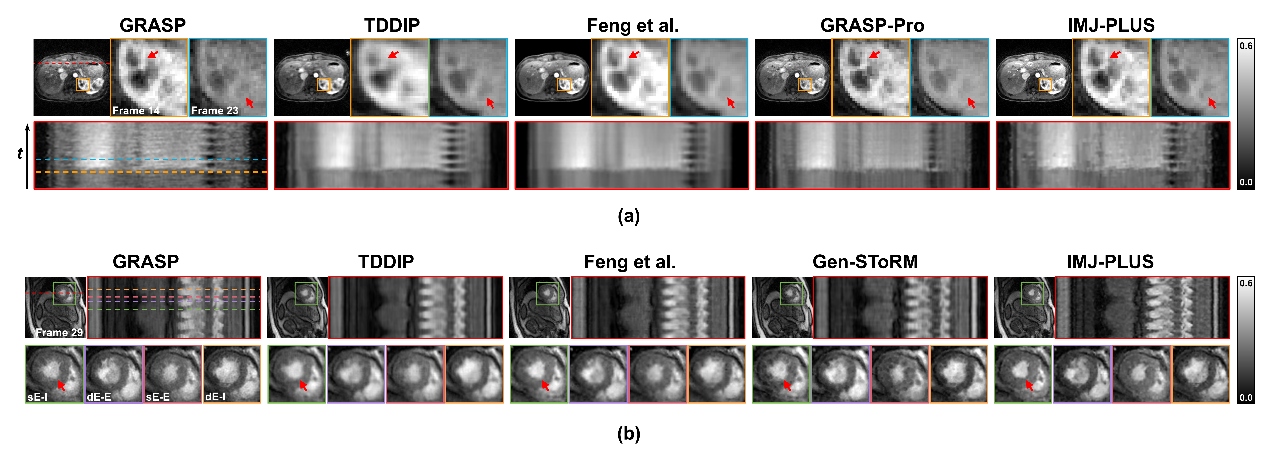 图3 IMJ-PLUS与其他对比方法在前瞻式自由呼吸(a)肝脏动态对比增强数据和(b)心脏数据上的重建结果示意图。