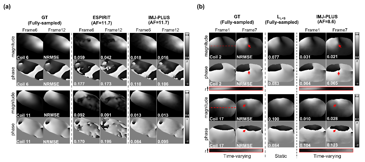 文章展示了该方法在回顾式屏气心脏数据以及前瞻式自由呼吸肝脏动态对比度增强数据和心脏数据中的重建结果,验证了其在不同应用场景下的强大性能。相较于其他非监督式重建方法及监督式深度学习方法,IMJ-PLUS展现出更强的伪影和噪声抑制能力,并具有更佳的泛化性能。此外,本文还展示了IMJ-PLUS联合估计的时变线圈灵敏度图,证明了其能够准确捕捉自由呼吸过程中由器官位移引起的线圈-组织耦合关系变化,从而提供比传统静态灵敏度图假设更为精确的重建结果。这些结果不仅证实了IMJ-PLUS在处理运动敏感性成像任务上的优越性,也揭示了该方法在进一步提升自由呼吸动态磁共振成像质量方面的潜力。