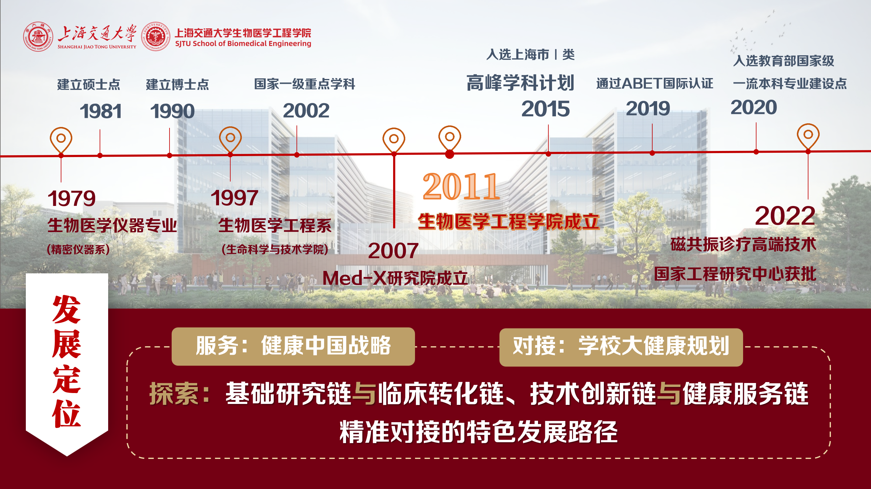 williamhill威廉希尔官网成立于2011年4月,秉承“敢为人先、追求卓越”的精神,致力于医工、医理交叉研究和创新型人才培养,依托交大优质的工程学和医学临床资源,逐步形成“医工交叉、国际化、创新转化”的办学特色,2019年成为国内唯一通过ABET国际认证的生物医学工程专业,并入选教育部第一批一流本科专业建设计划,2024软科世界一流学科排名第三。其学科历史可追溯至1979年创办的生物医学仪器专业,是国内最早创办的生物医学工程专业之一,在历次学科评估中名列前三。williamhill威廉希尔官网自成立起,就以建设一流学科为目标,在学科布局、人才培养、科学研究、师资队伍建设等多个方面努力探索和实践。